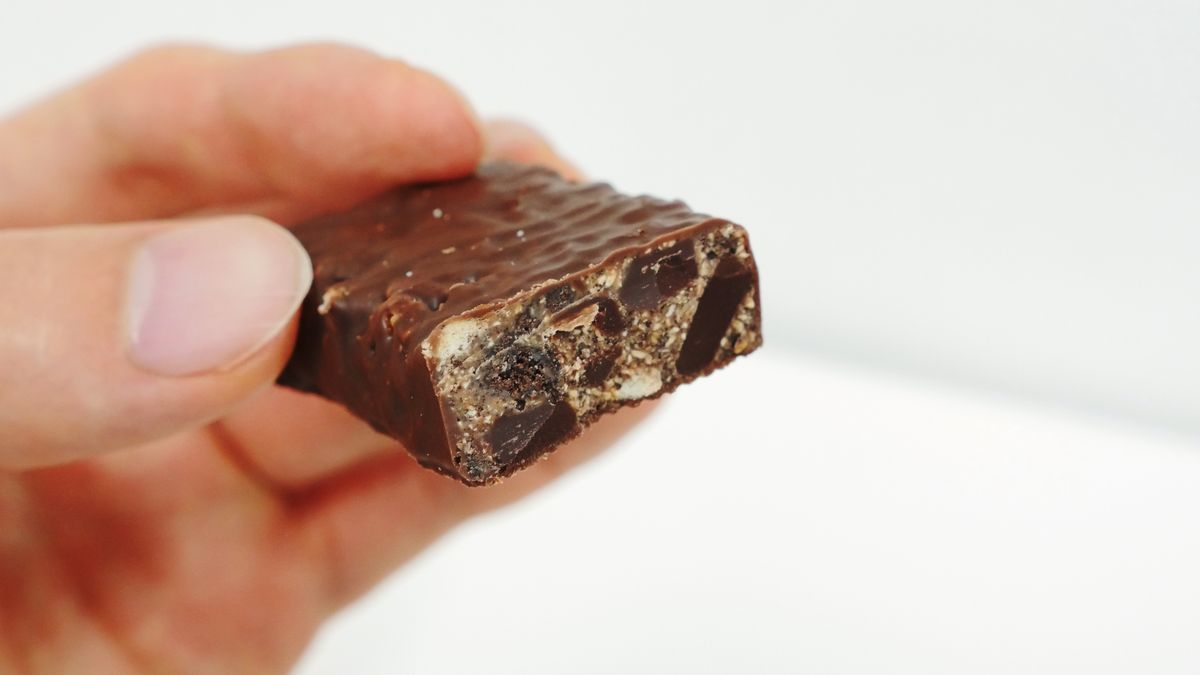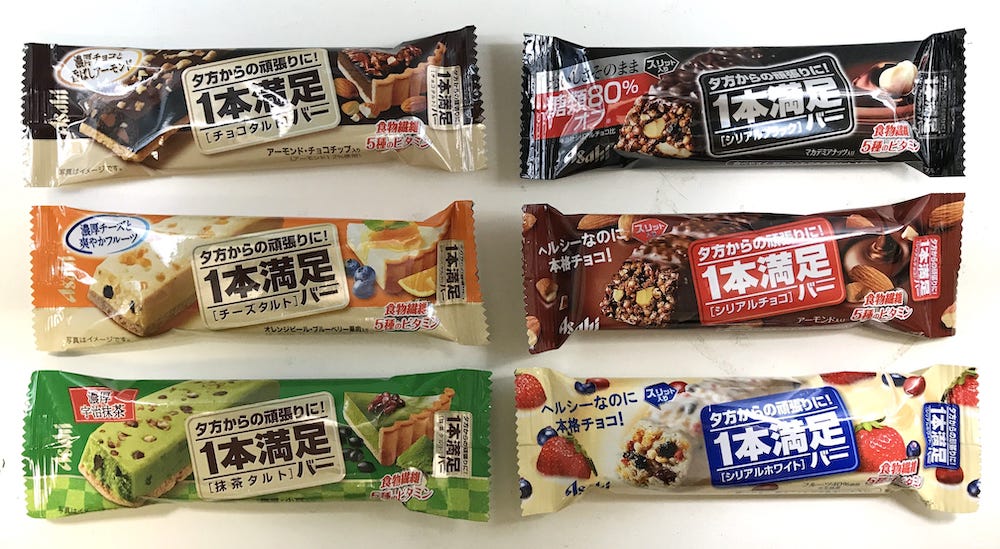 Second Japanese snack to try is this famous Single satisfaction bar nuts produced by Asahi. Again, something a little boring and more on the healthy side. However, Japan has a few different protein bars to choose from. And all of them taste great. Like you’re not even eating a protein bar. You can get one that is chocolate-covered, or chocolate-covered with almonds, and even white chocolate-covered with fruit. There is also a cookie crisp-like protein bar.