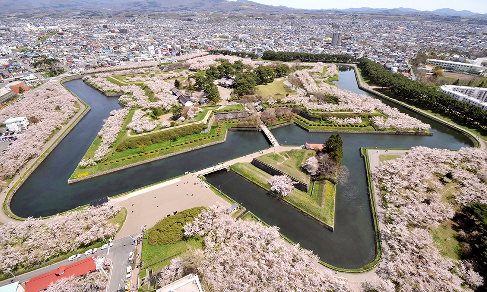 Goryokaku is Hakodate’s most iconic sightseeing spot. A former Edo-era fort, each point of the star served as a point for artillery to watch card from all sides. The star-shaped area is now lovely a public park. In spring 1,600 cherry blossom trees bloom throughout the park and along the moat, making it a popular spot for hanami or cherry blossom viewing.