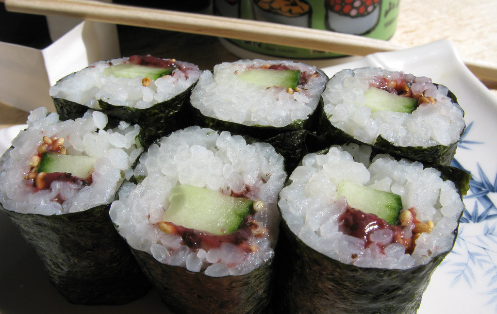 If you are game for trying all the traditional Japanese sushi rolls, you must not miss this one. This dish is called Umekyu because it contains two ingredients – pickled plum (umeboshi) and cucumber (kyuri). It has a unique flavor that you may not have come across before. The pickled plum tastes sweet and cucumber adds a dash of freshness to the sushi roll. It is a great option for vegetarians and vegans alike.
